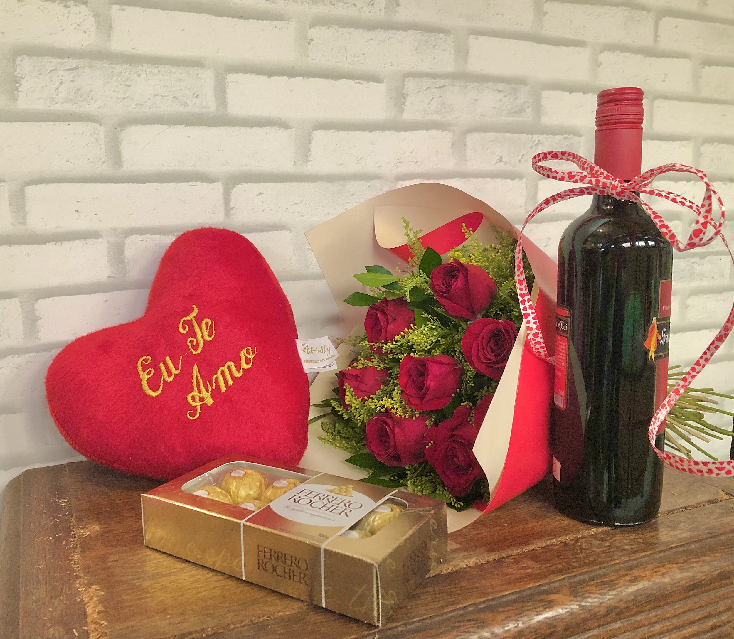 Combo G : Buquê com 12 rosas nacionais + bombom Ferrero Rocher + pelúcia coração + vinho nacional